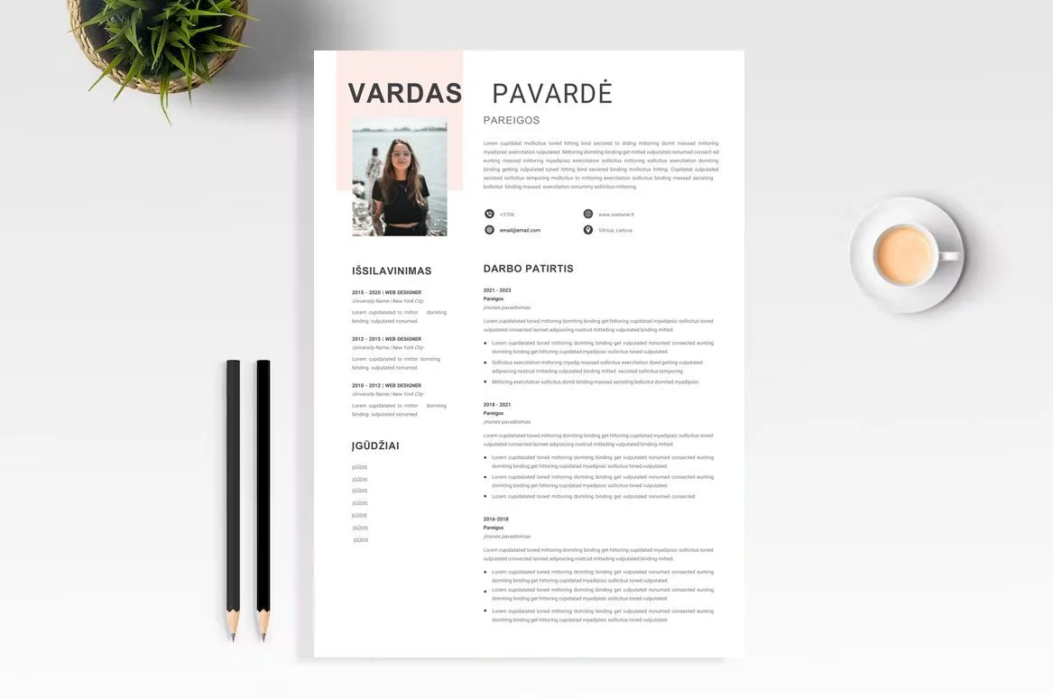 Šis CV šablonas yra puikus pasirinkimas tiems, kurie ieško darbo arba planuoja keisti karjeros kryptį. Tai yra patogus, tvarkingas ir lengvai redaguojamas spausdinimo šablonas, kuris padės jums sukurti profesionalų ir išsiskiriantį CV ir motyvacinį laišką.